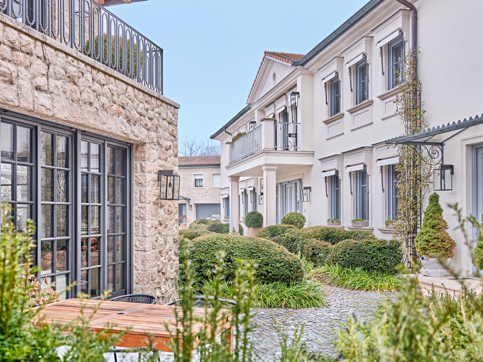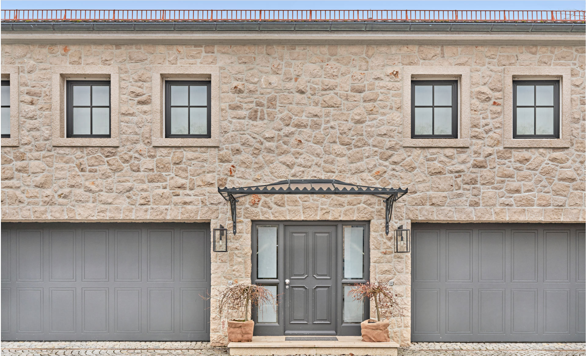 The automotive logistics are designed with generous proportions in mind: two double garages (approx. 70 m²) accommodate the daily fleet, complemented by 4–8 outdoor parking spaces and a dedicated area for a motorhome, boat, or truck. No compromises in accommodation. No improvisation for guests.
